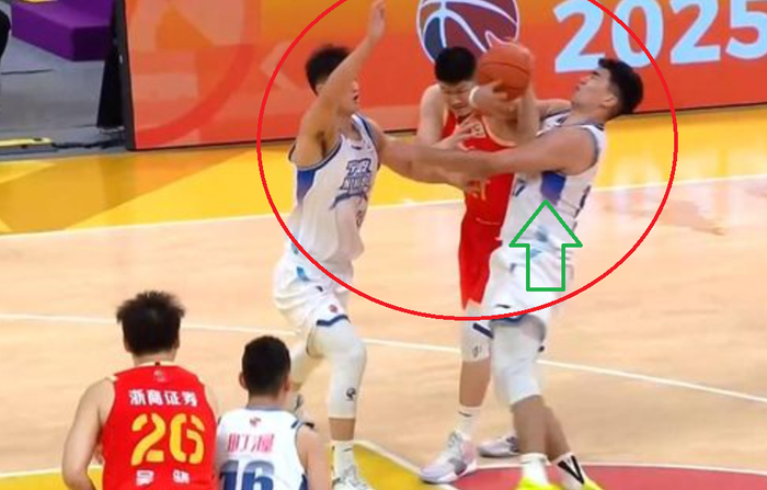 广厦队球员胡金秋,在接到队友的传球,刚想要发动进攻,然而,就在这个时候,宁波队两名球员对胡金秋进行包夹,我们可以看到,宁波队中锋鲁吐布拉,从胡金秋的身后冲过来,二话不说,就与胡金秋纠缠在一起。